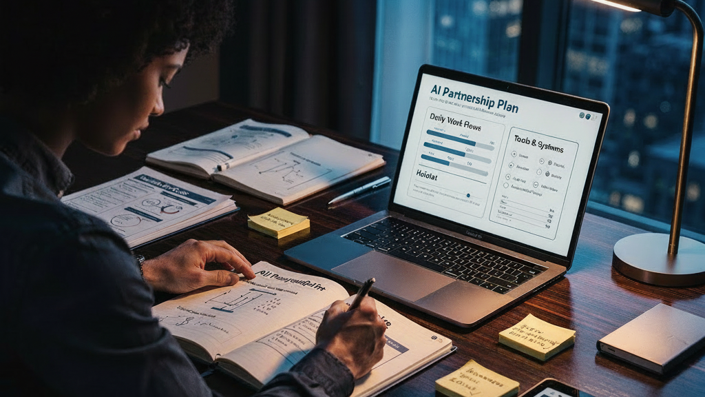 This is where the framework becomes personal. You design how you and AI work together — not from a template, but from your own context, priorities, and standards. The result is a partnership structure that holds even when pressure rises or time compresses.